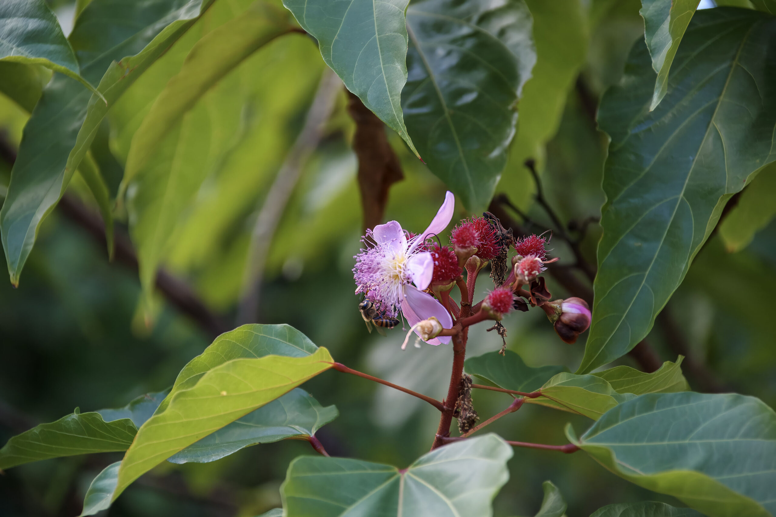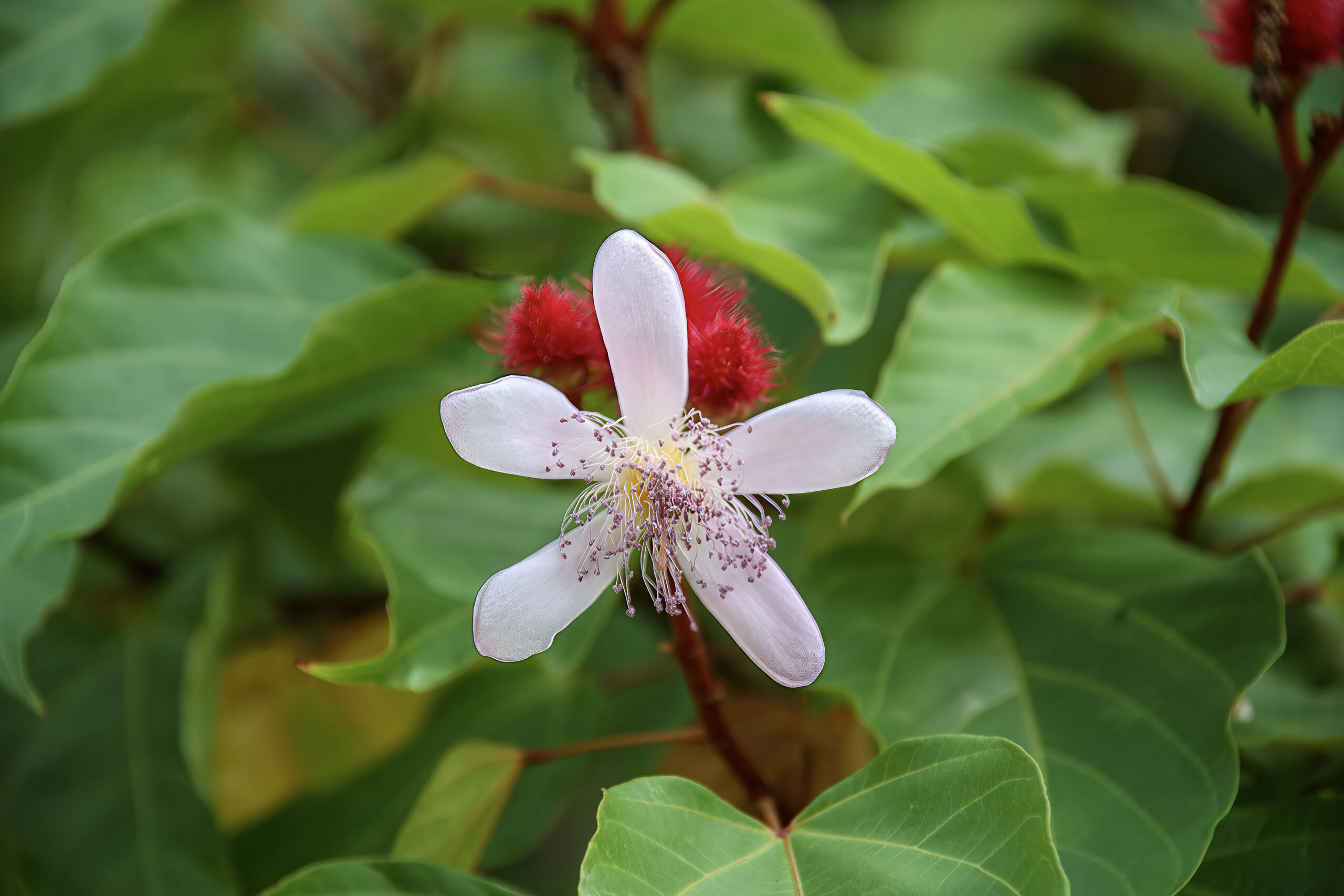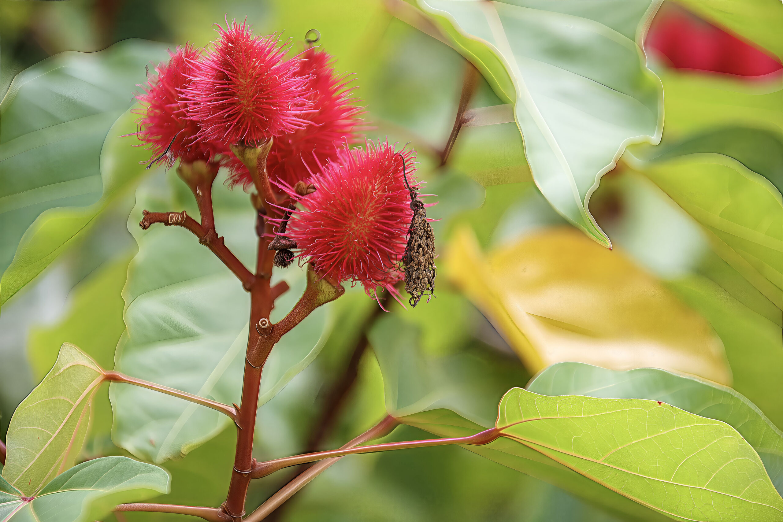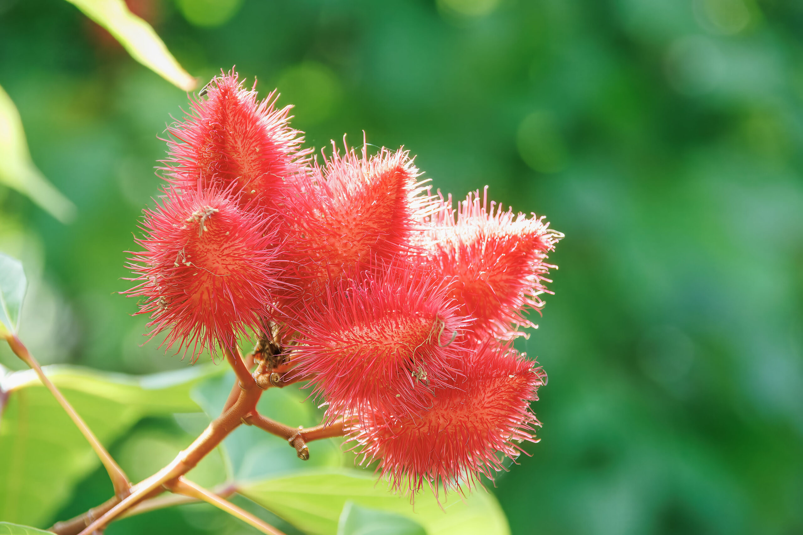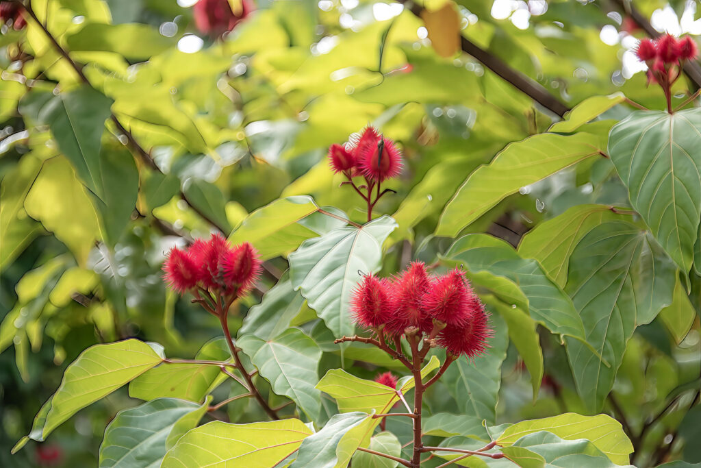 Fruits are bristly, reddish capsules that split open when ripe, revealing dozens of small red seeds coated in annatto dye (bixin).
