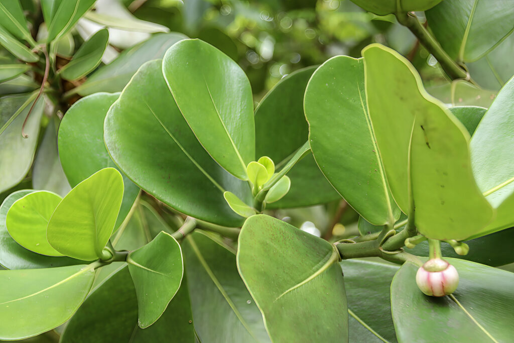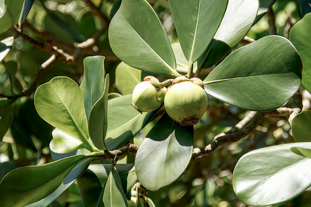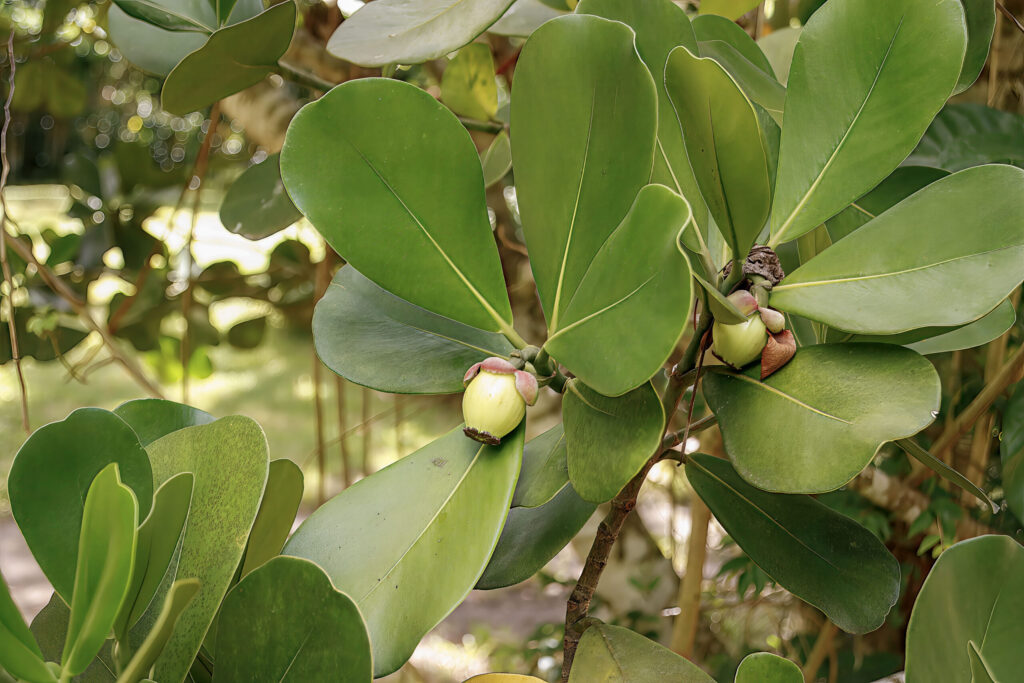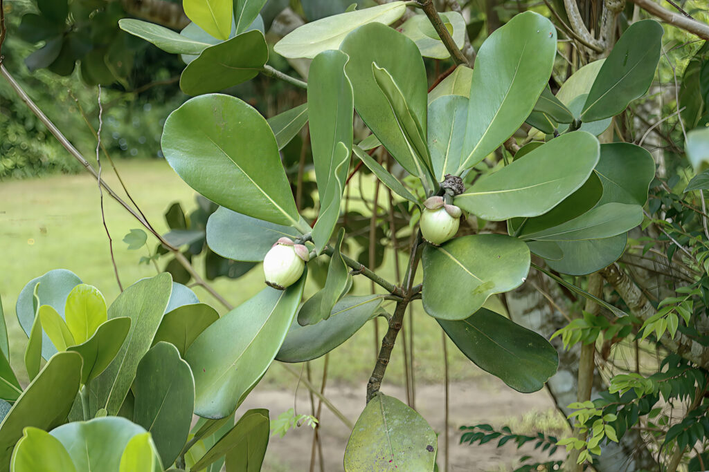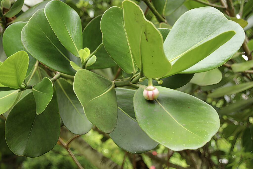 This tree is evergreen, with broad, leathery, dark green leaves that are opposite and obovate (wider at the tip).