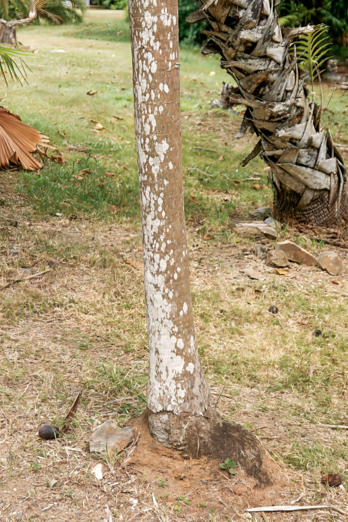 - Trunk: Slender, solitary, gray trunk that can reach 6–10 meters tall; often with a skirt of retained dead leaves in wild specimens.