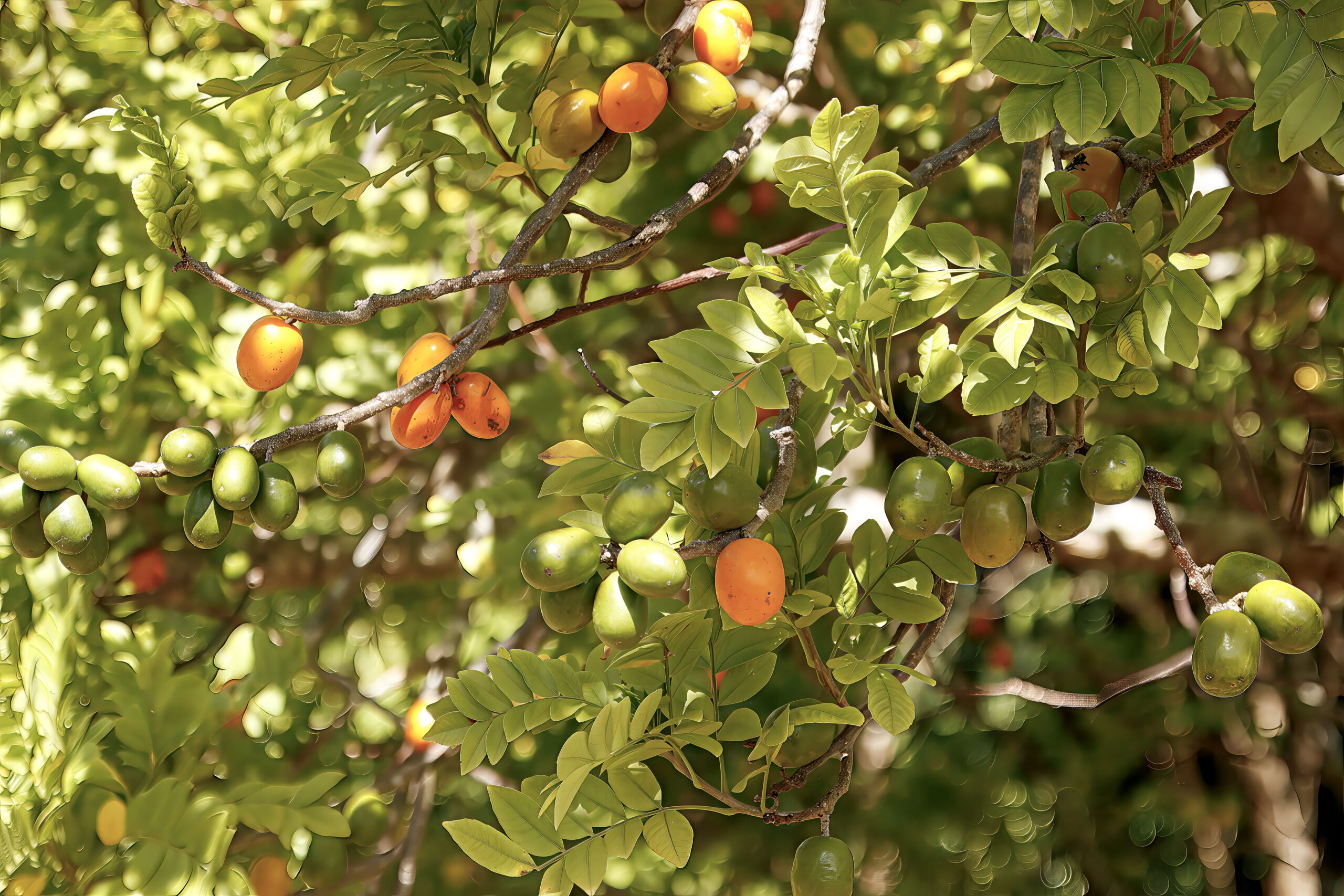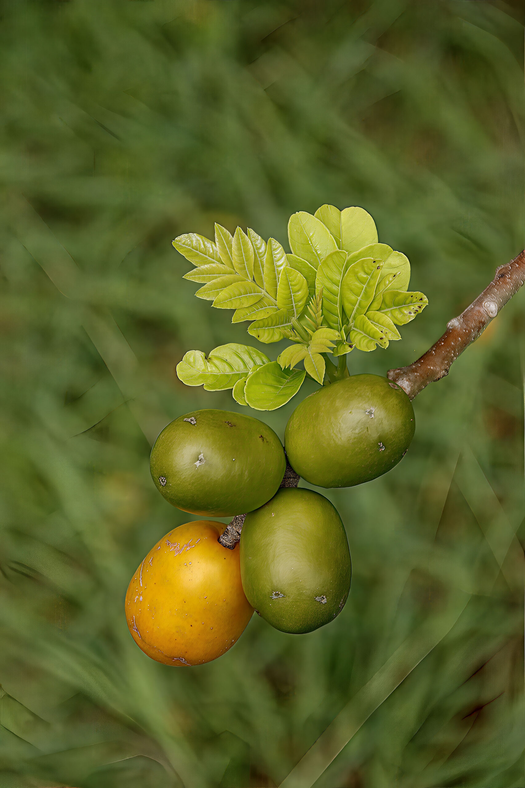 The fruit is an oval, green drupe that ripens to golden-yellow. It has a fibrous interior and central stone.