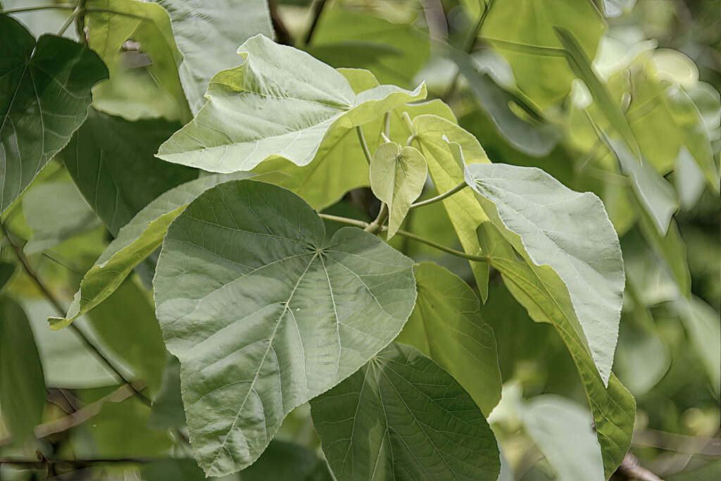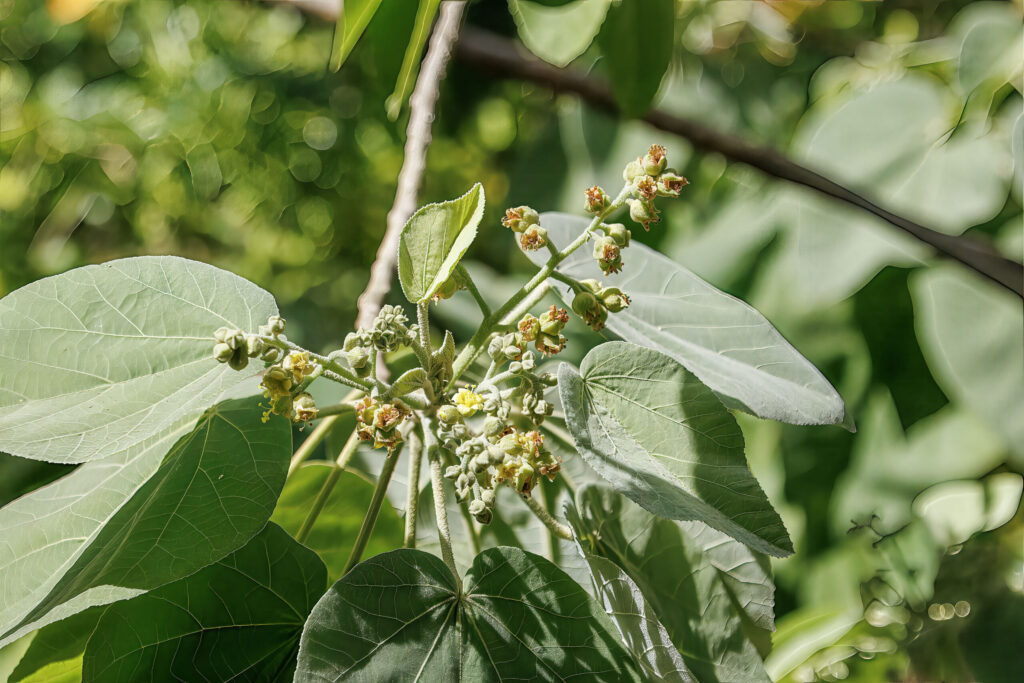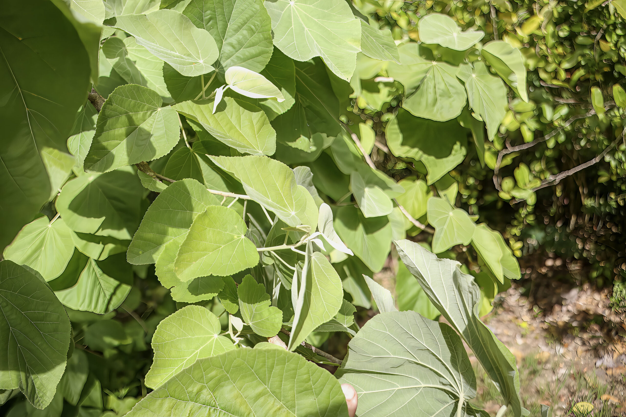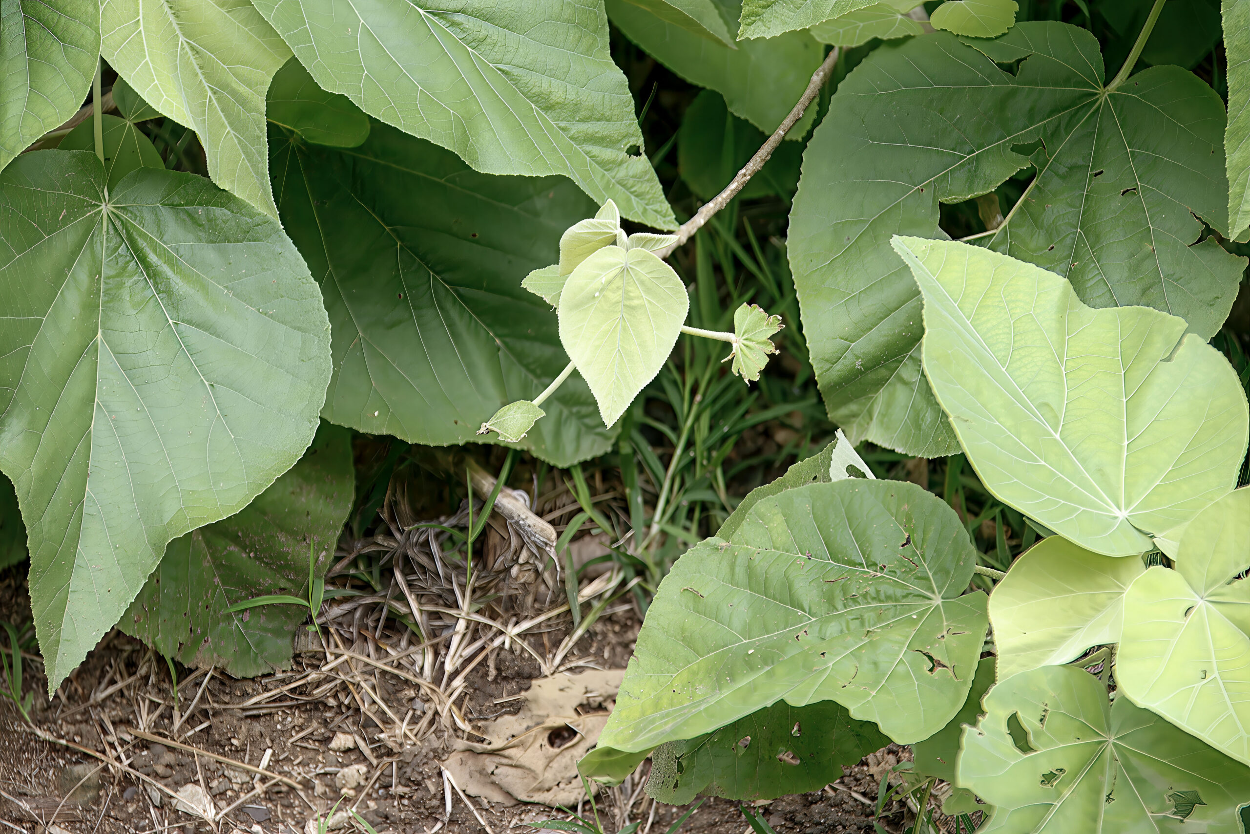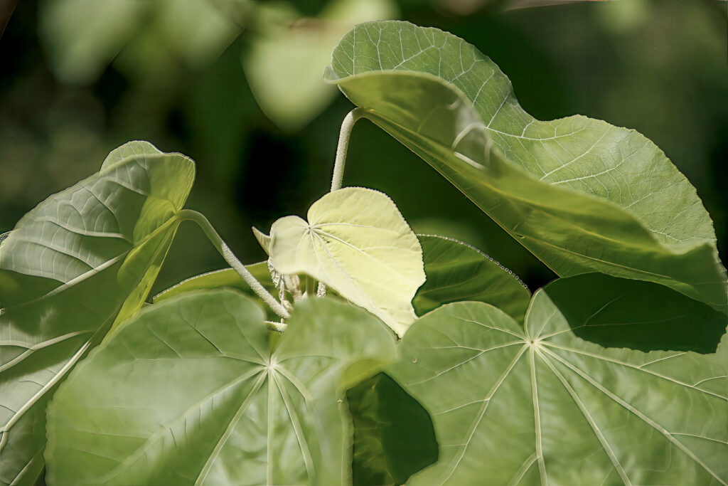 • Leaves: Large, heart-shaped, and deeply lobed with a velvety texture.