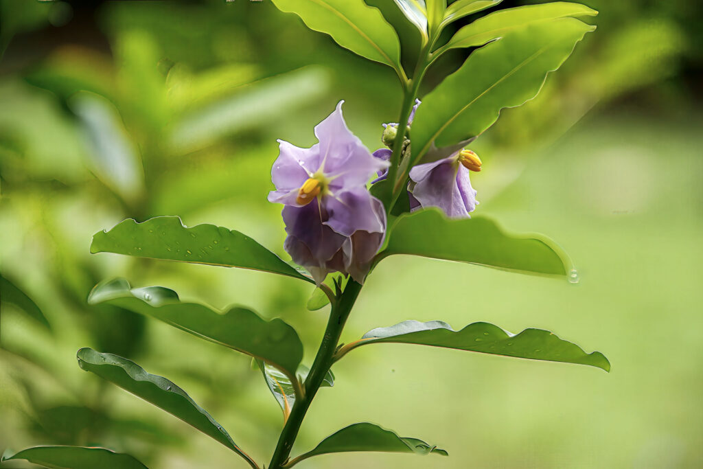 Flowers are violet to purple, star-shaped with prominent yellow stamens, typical of the nightshade family.