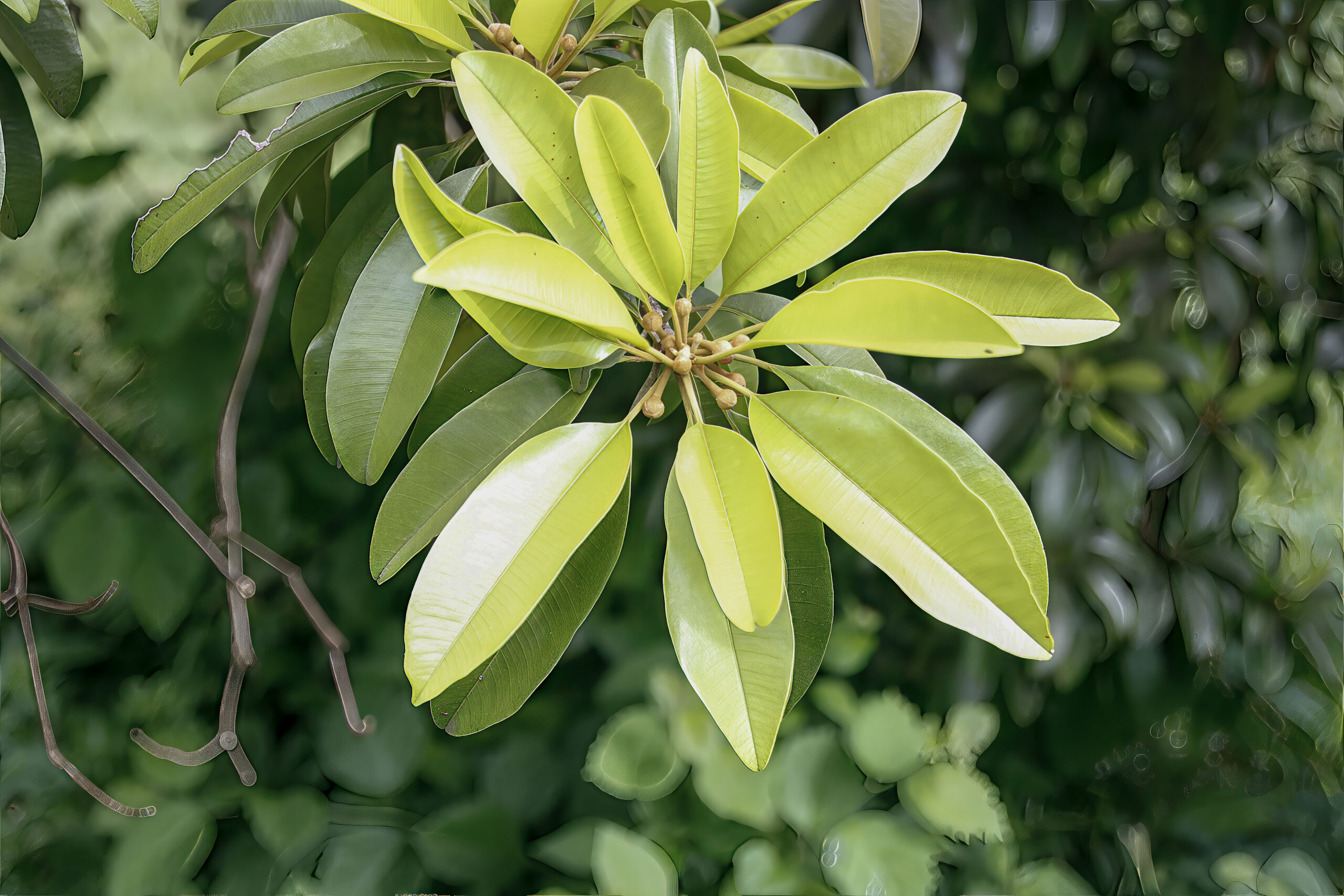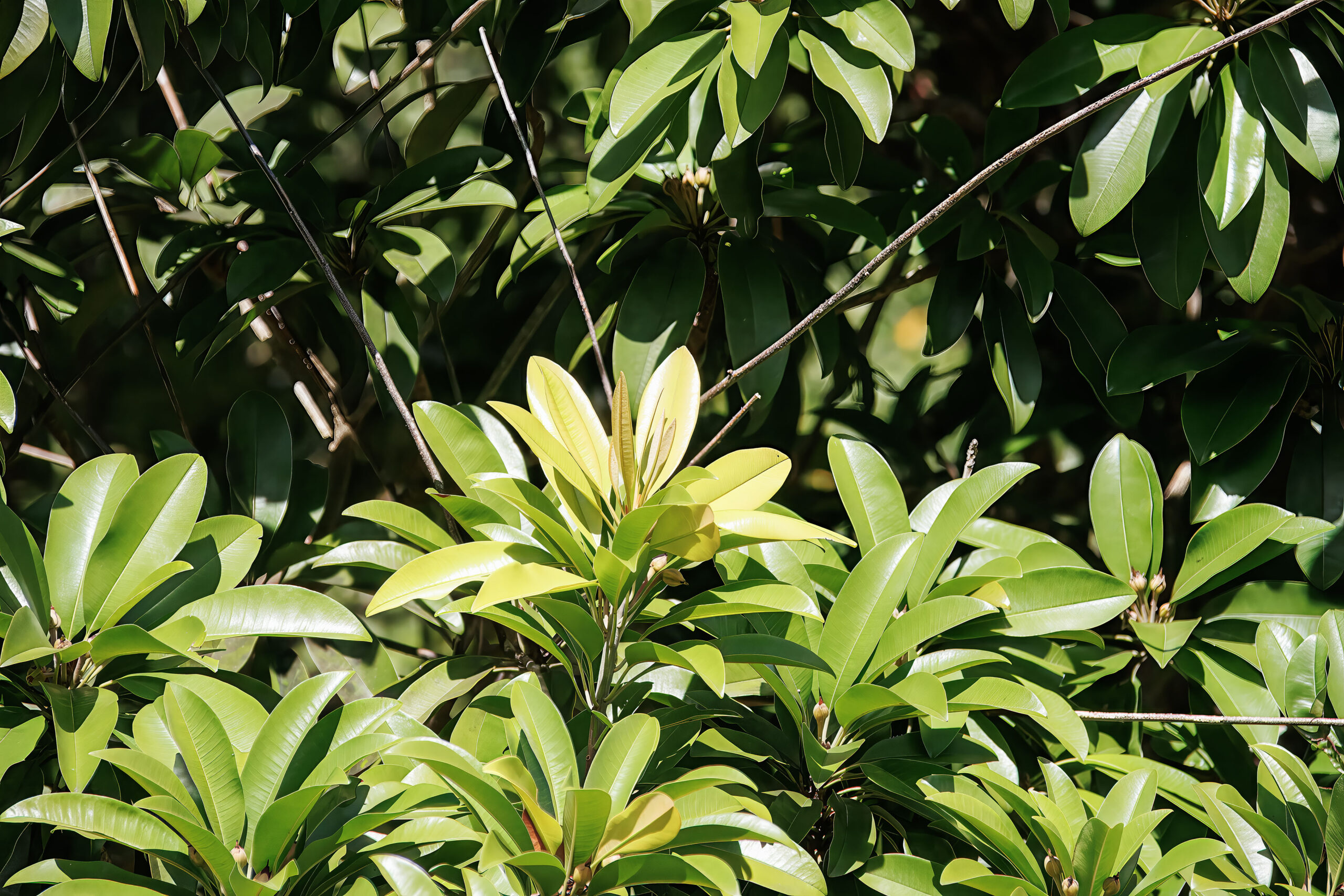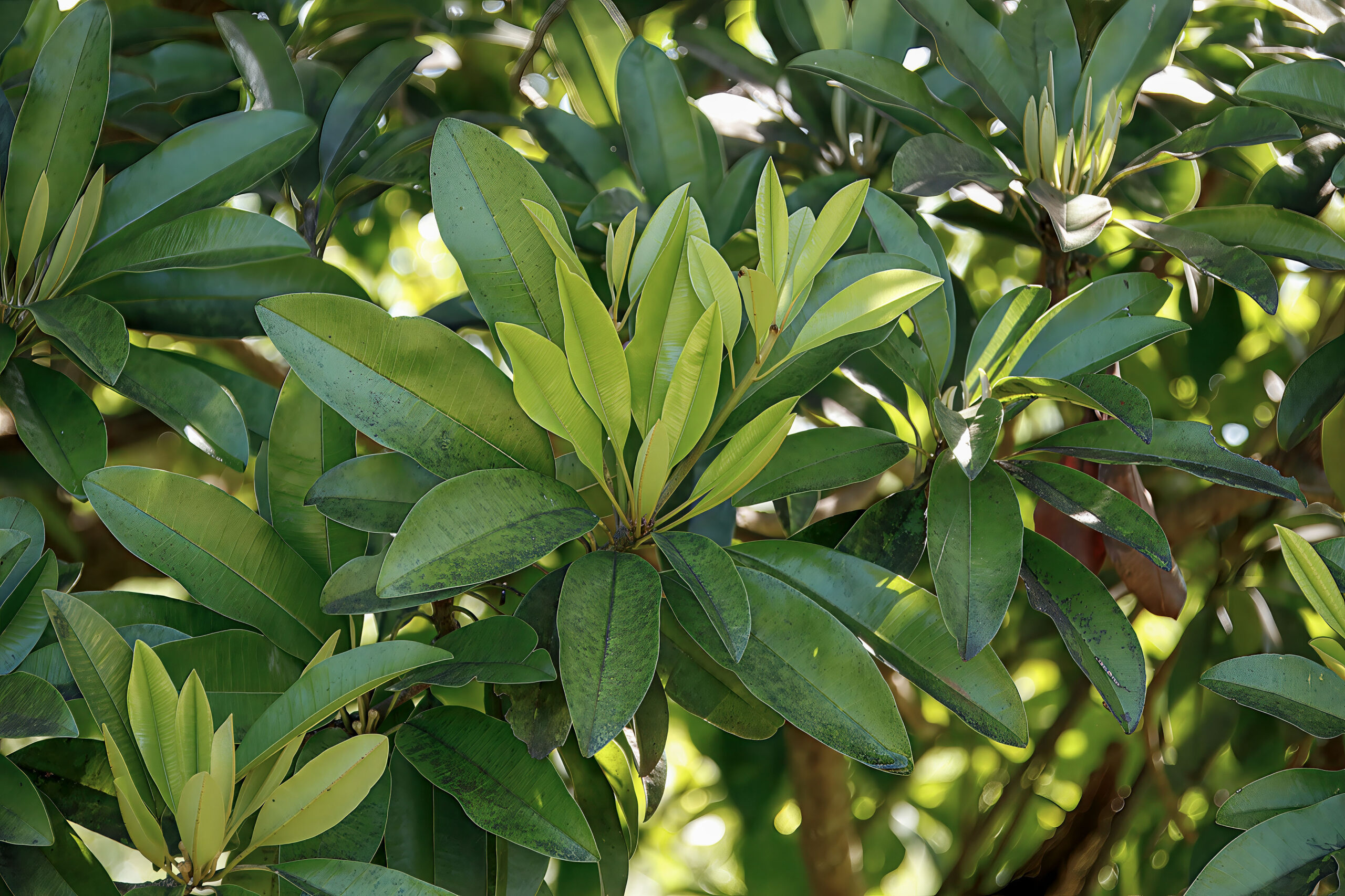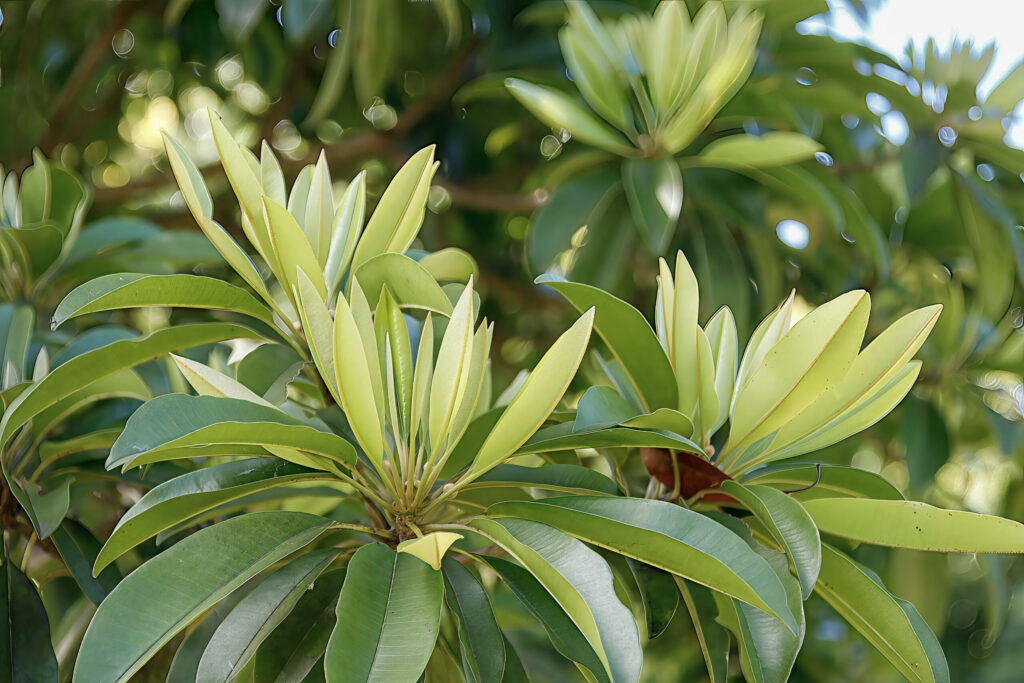- New leaf flushes are subtle, usually appearing in light green clusters at branch tips.