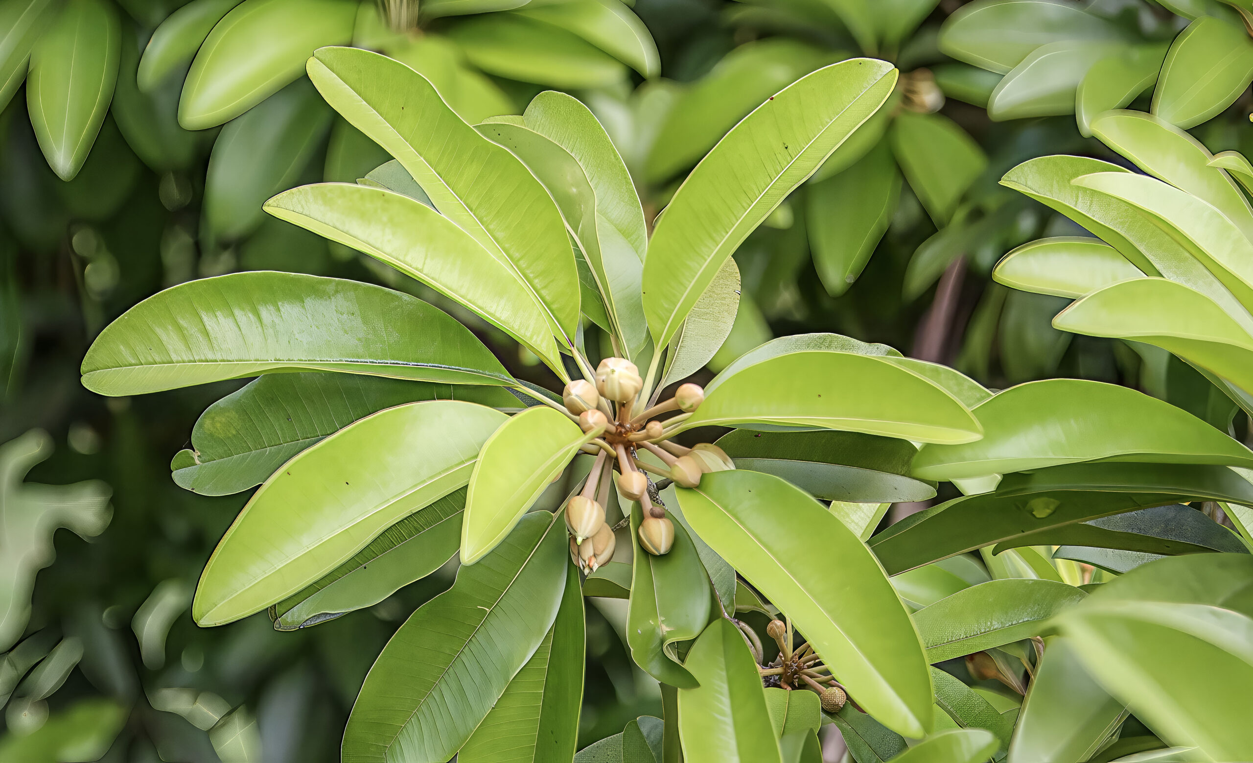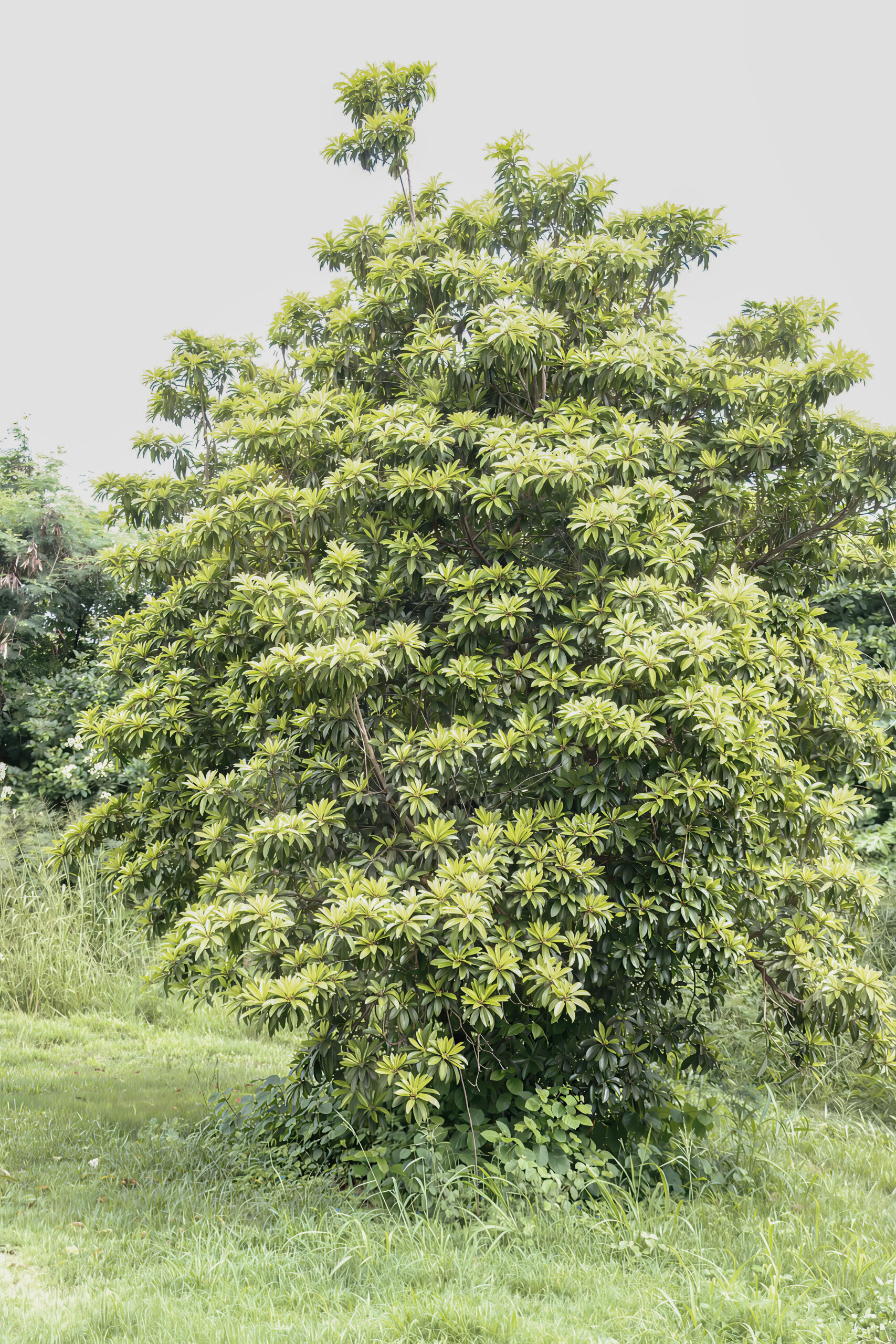 Manilkara zapota is evergreen, with simple, glossy, dark green leaves that are elliptical to oblong in shape.