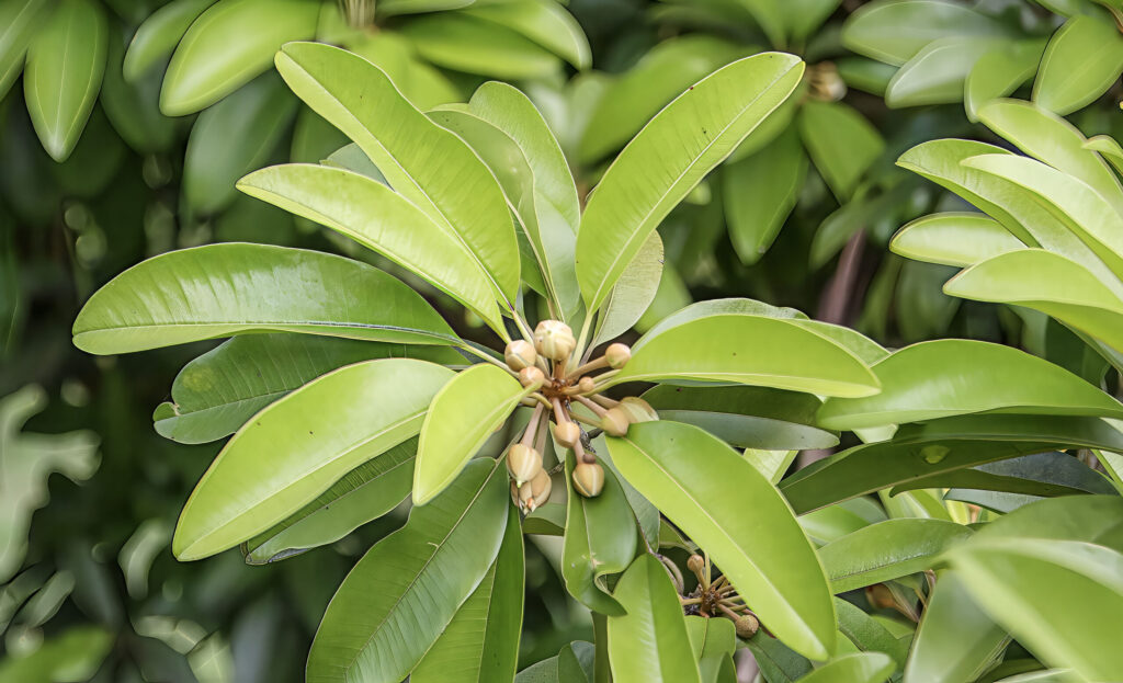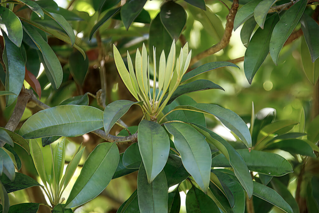 - Leaves are tough and leathery, remaining on the tree for extended periods.
