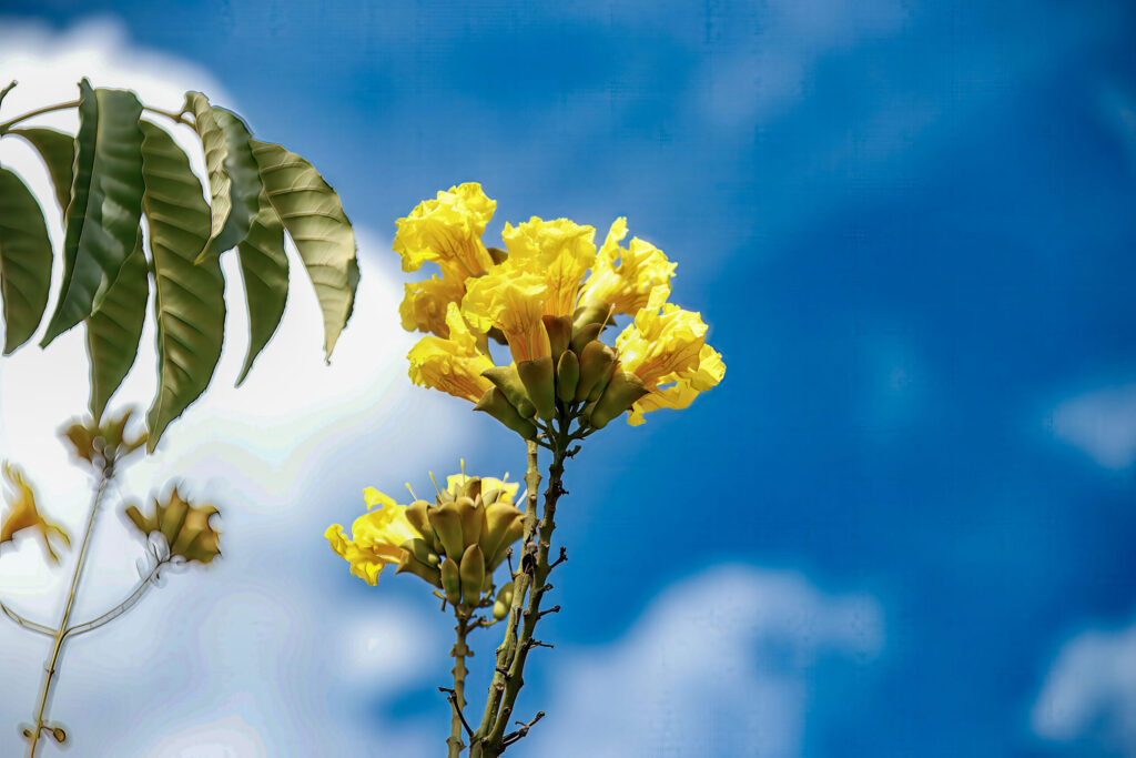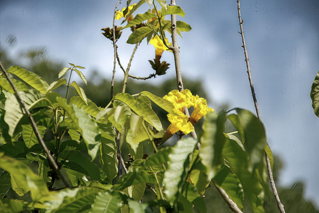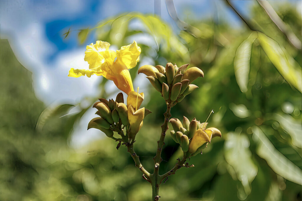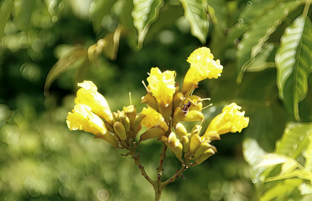 - Inflorescence: Terminal panicles of large, trumpet-shaped golden yellow flowers with maroon markings in the throat