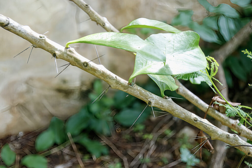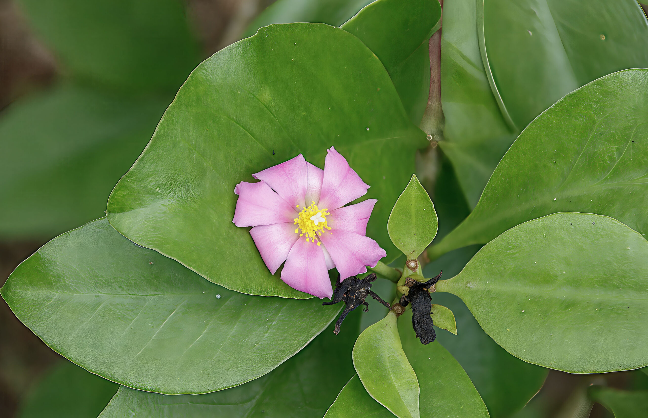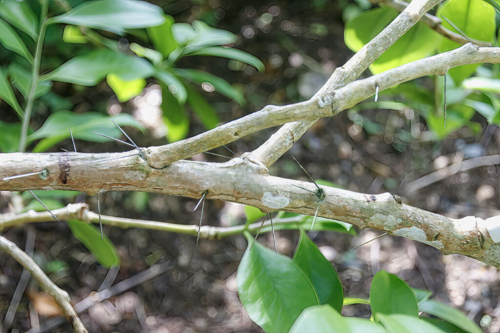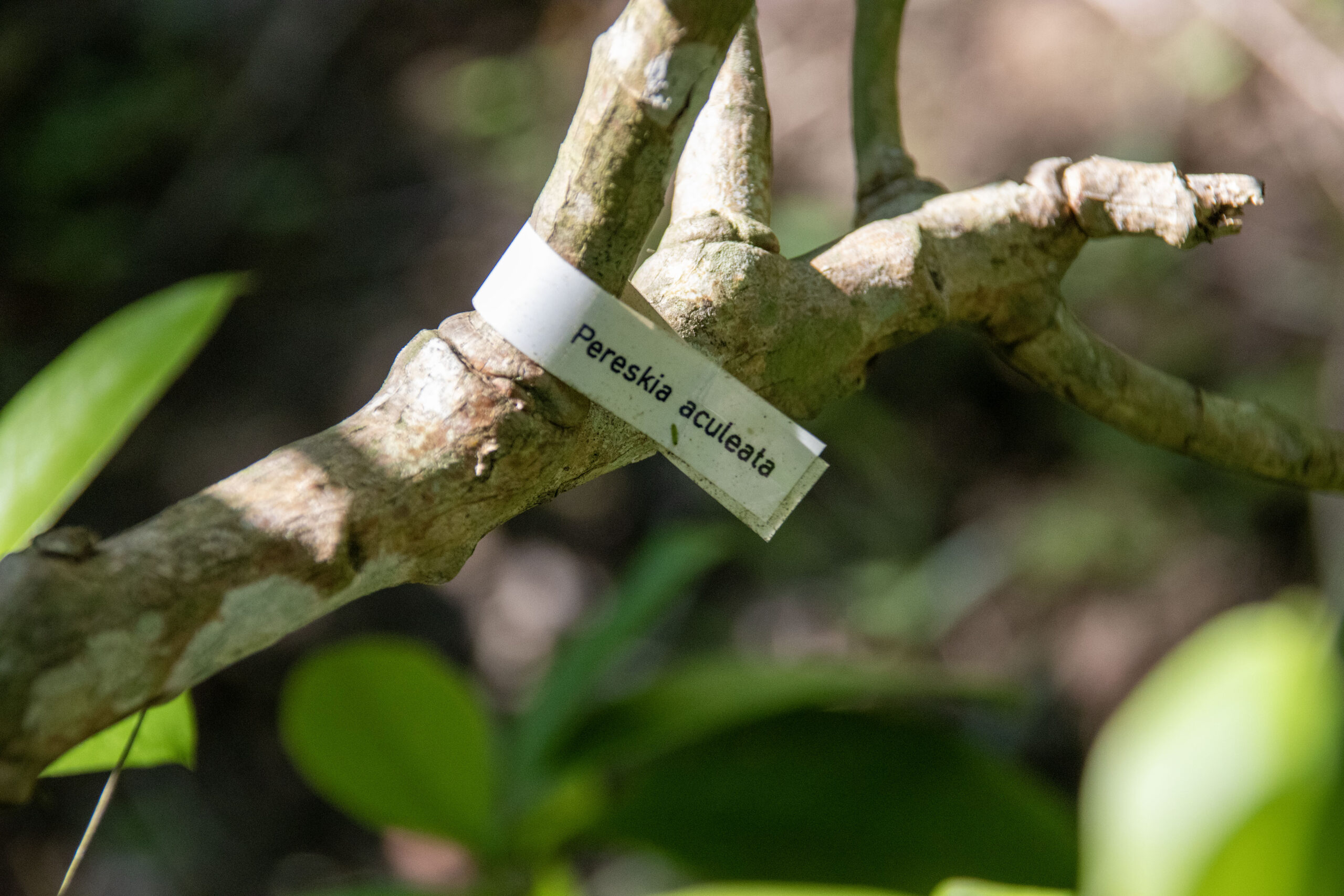 Unlike most cacti, Pereskia aculeata retains true leaves. The plant is evergreen to semi-deciduous, depending on rainfall and exposure. In wetter microhabitats, leaves persist year-round, though in exposed or drought-prone areas, partial leaf drop may occur during the dry season.