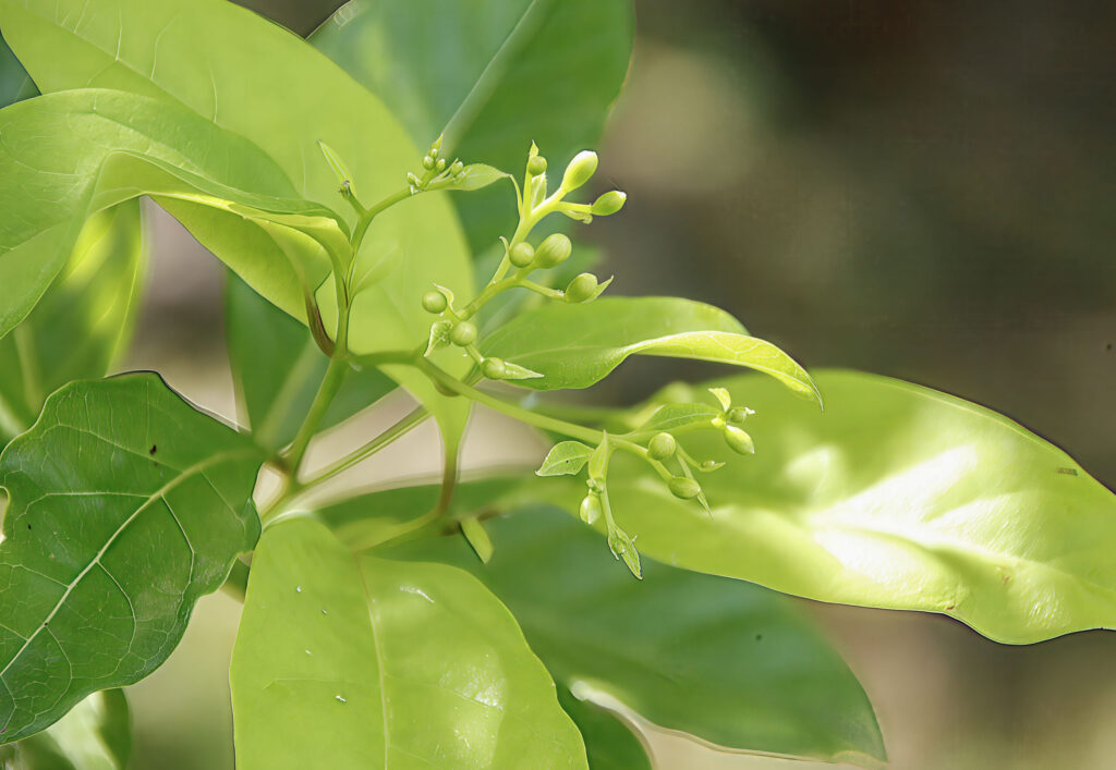 - Leaves: Broad, ovate, and glossy with a leathery texture. The leaves are dark green and arranged alternately along the branches. They have prominent veins and are somewhat waxy to the touch.