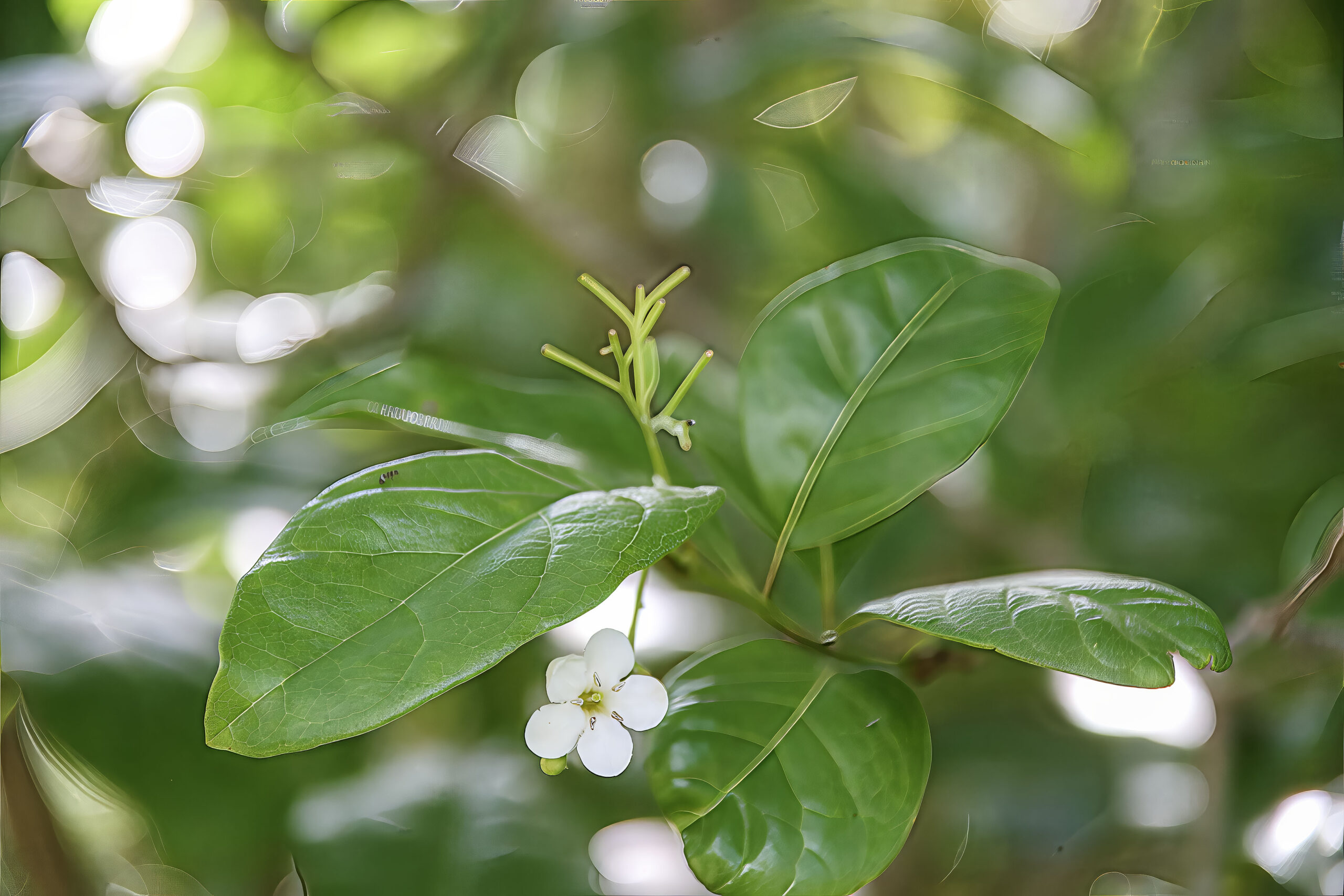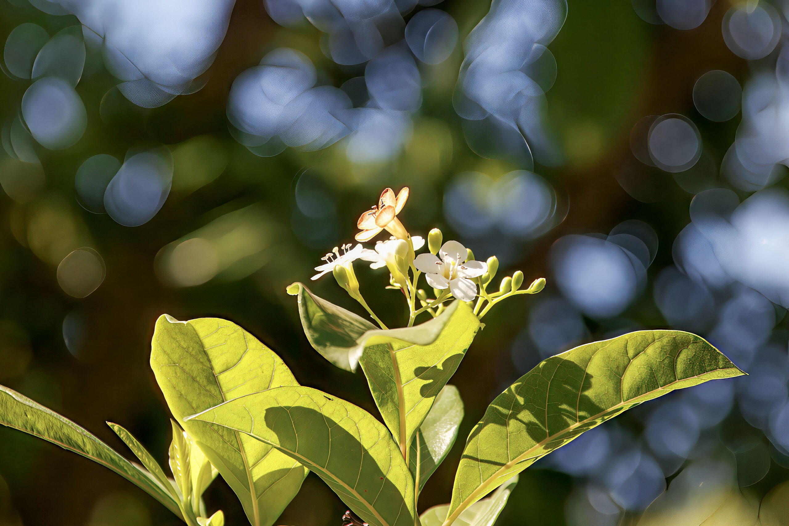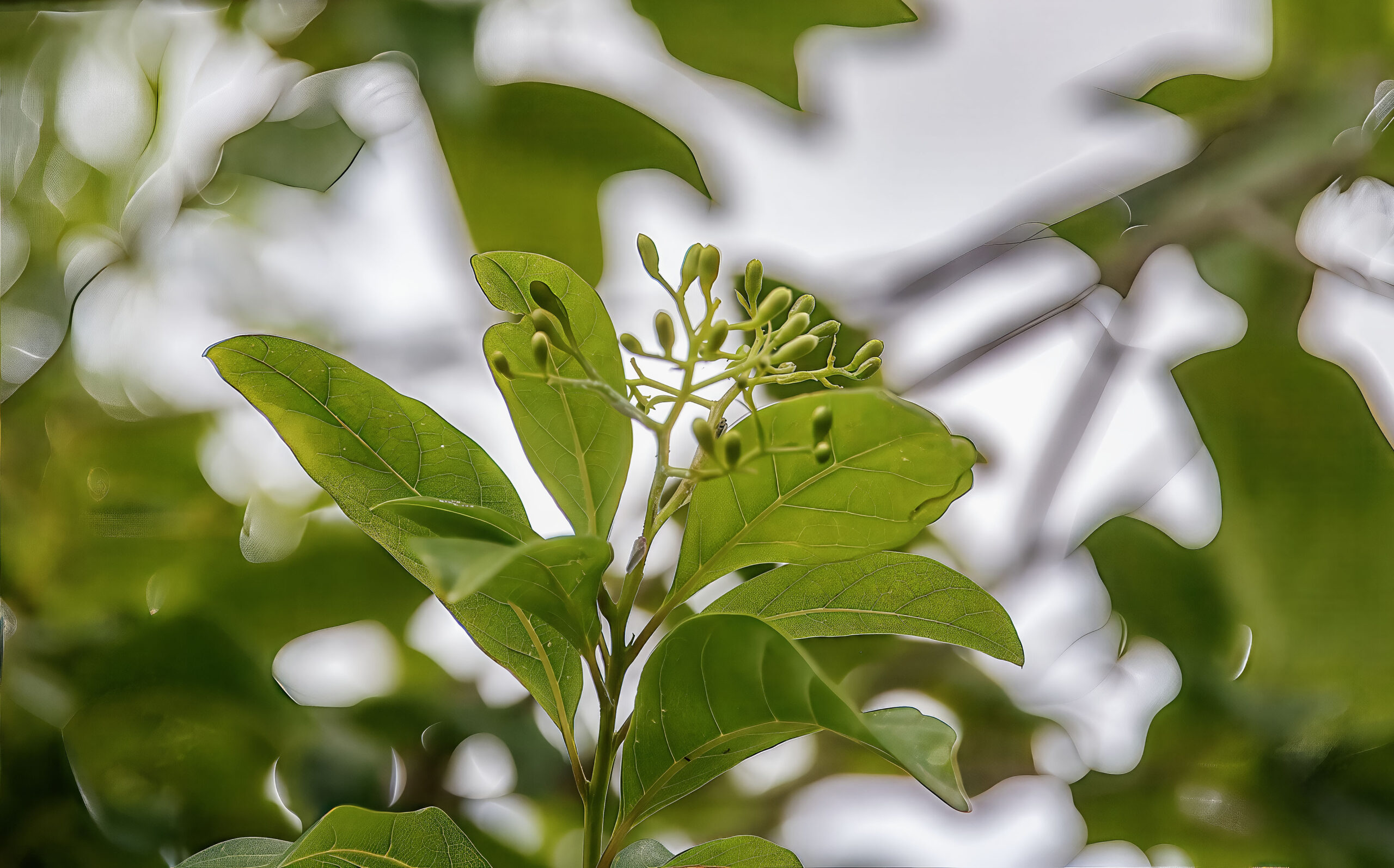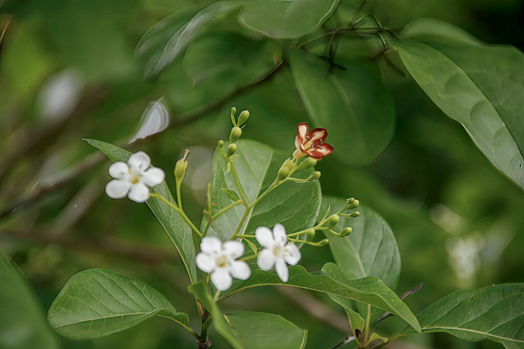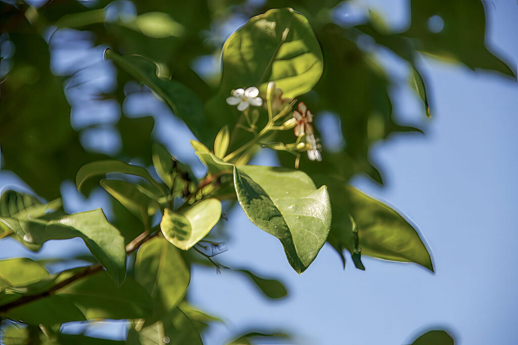 - Flowers: Small, white, funnel-shaped flowers that are clustered in cymes. The flowers are fragrant, attracting pollinators like bees and butterflies.