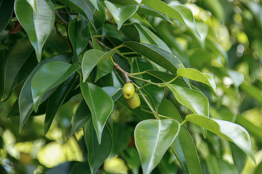- Observe the appearance of small green figs directly on twigs or leaf axils.