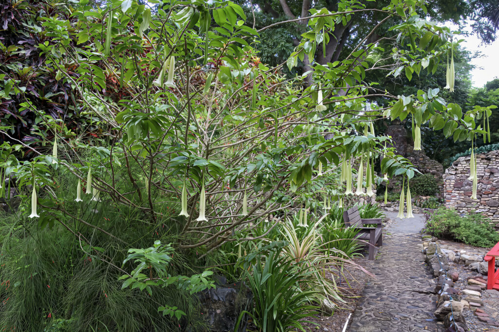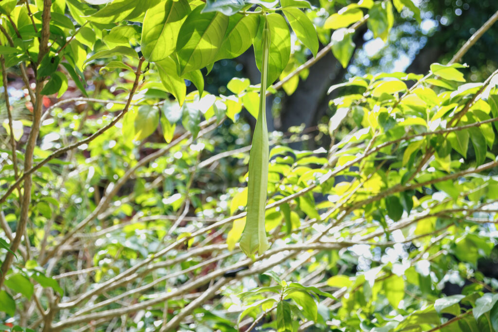 - Flower Characteristics: Large, bell-shaped, pale greenish to white flowers, often facing downward; blooms may last several days.