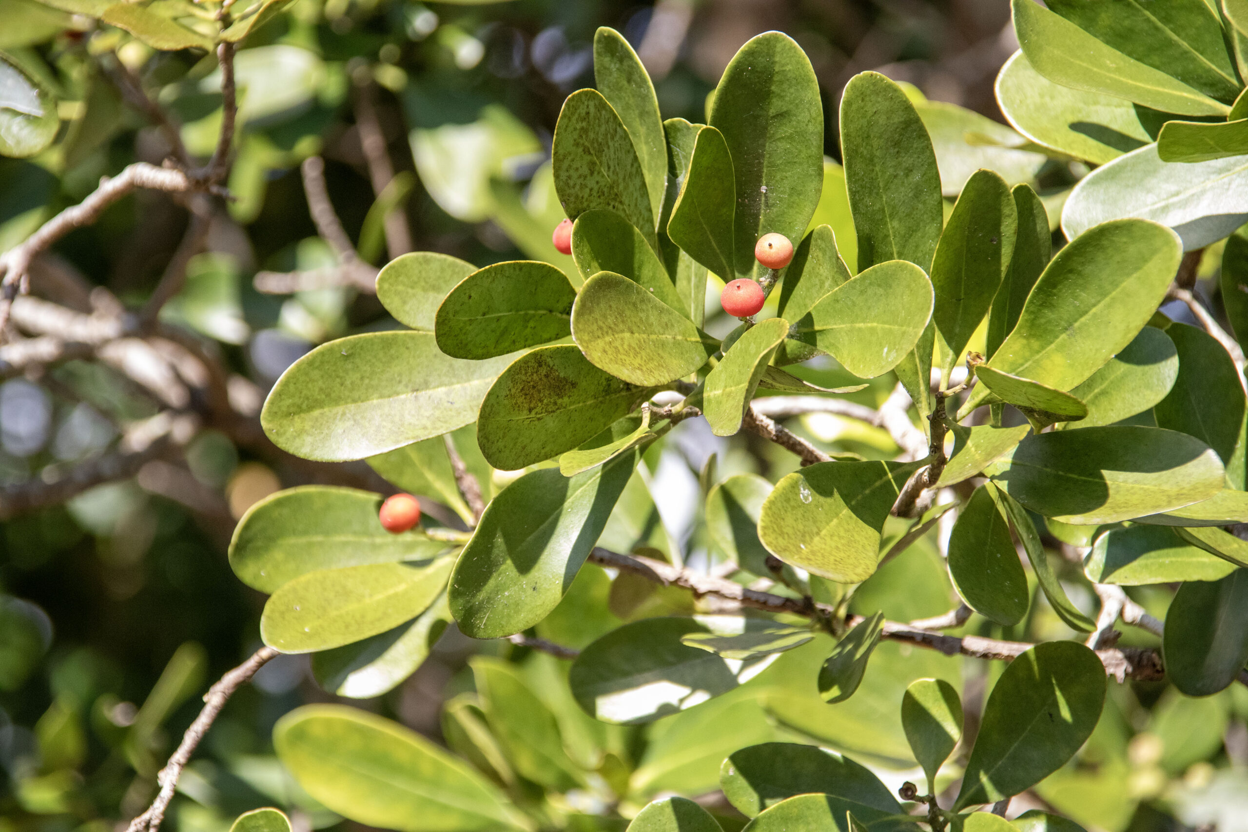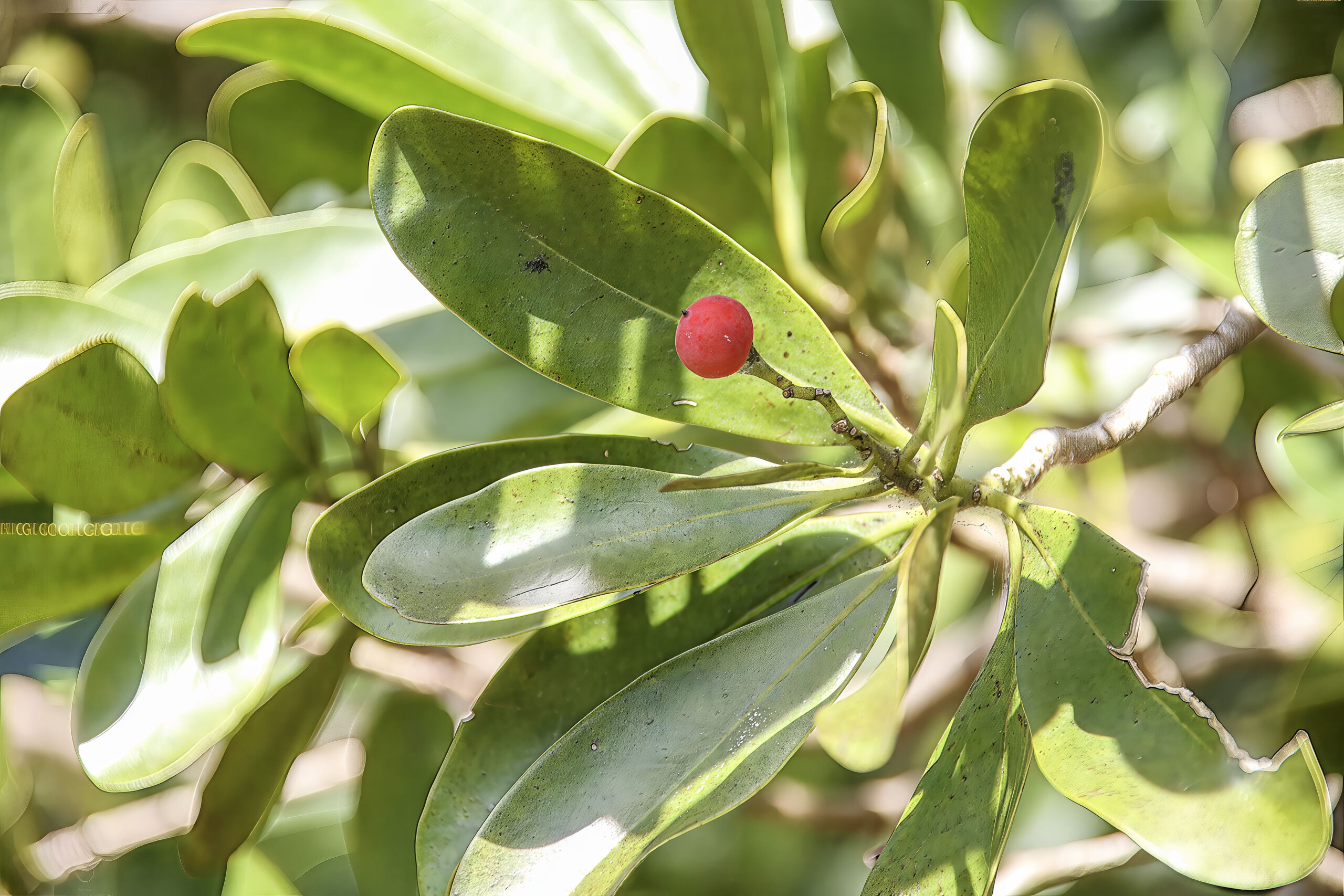 Wild Cinnamon is evergreen, maintaining its shiny, leathery, dark green leaves throughout the year.