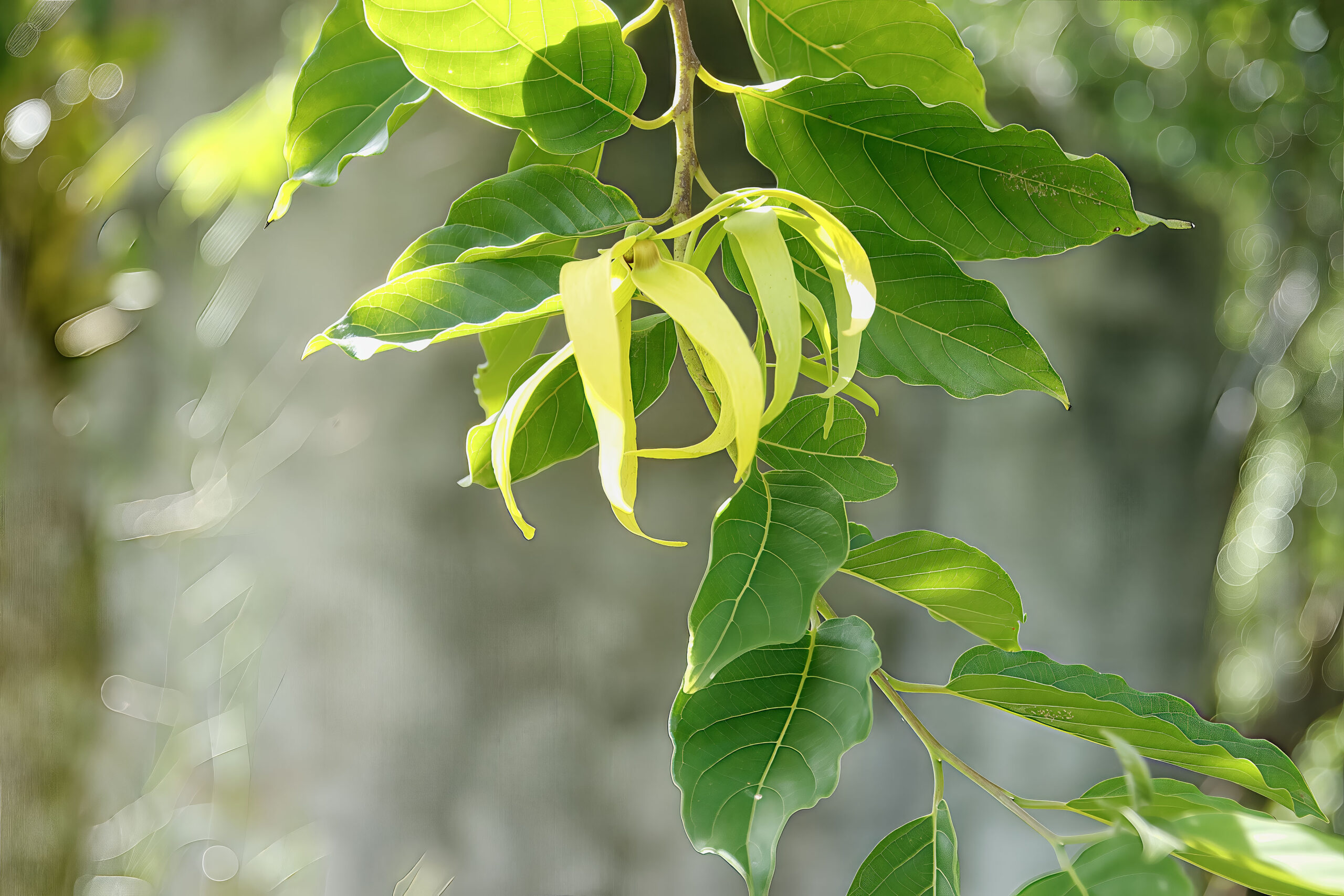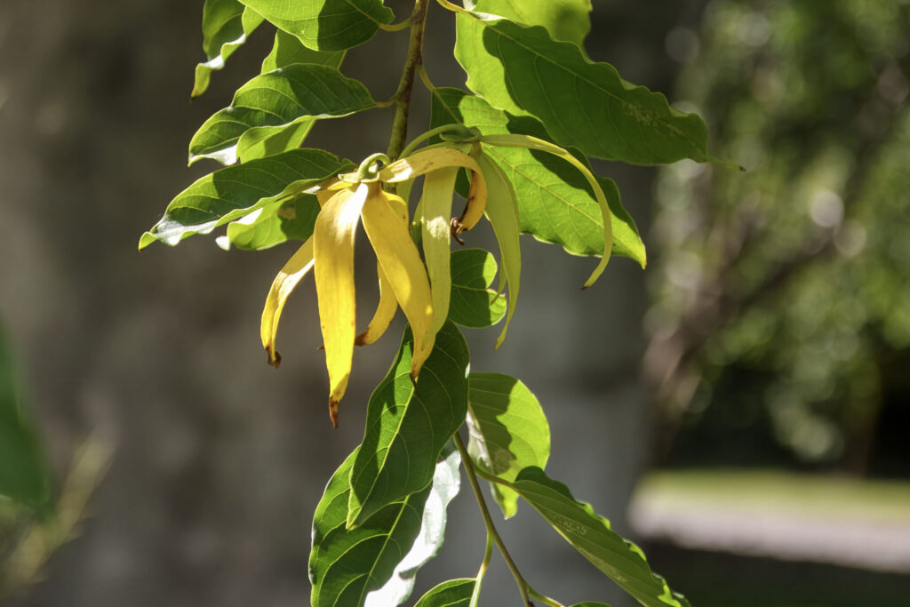 Ylang Ylang is renowned for its long, drooping, star-shaped flowers with narrow petals that start out greenish and become bright yellow as they mature. The scent is strongest at night.